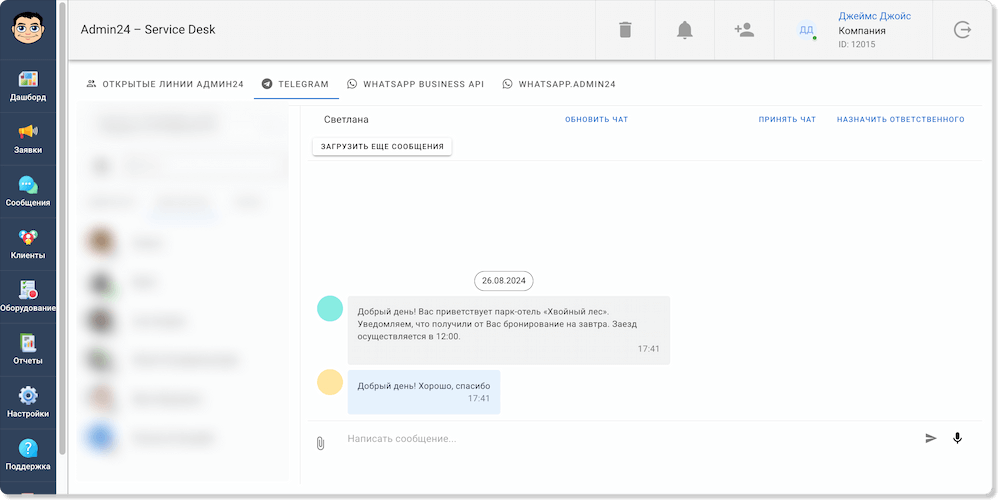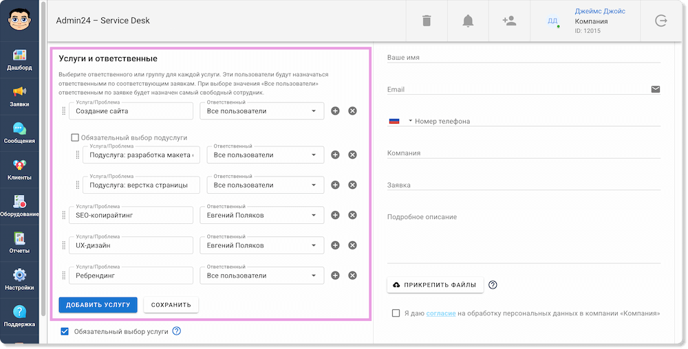 Автоматическое распределение заявок. В Admin24 можно создать каталог услуг и за каждого услугой закрепить ответственного сотрудника.