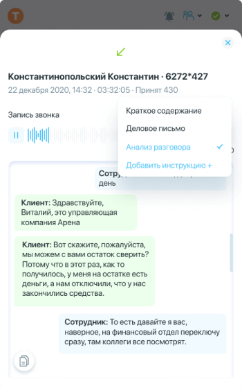 Любой записанный звонок можно проанализировать, чтобы оценить разговор, дать рекомендации по улучшению качества консультации, а также подготовить проект письма-протокола по итогам общения.