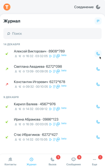 Из браузера можно посмотреть список внутренних номеров и журнал звонков: прямой или добавочный, входящий или исходящий номер, имя абонента, продолжительность ожидания ответа. Если АТС записывает звонки, можно прослушать разговор.